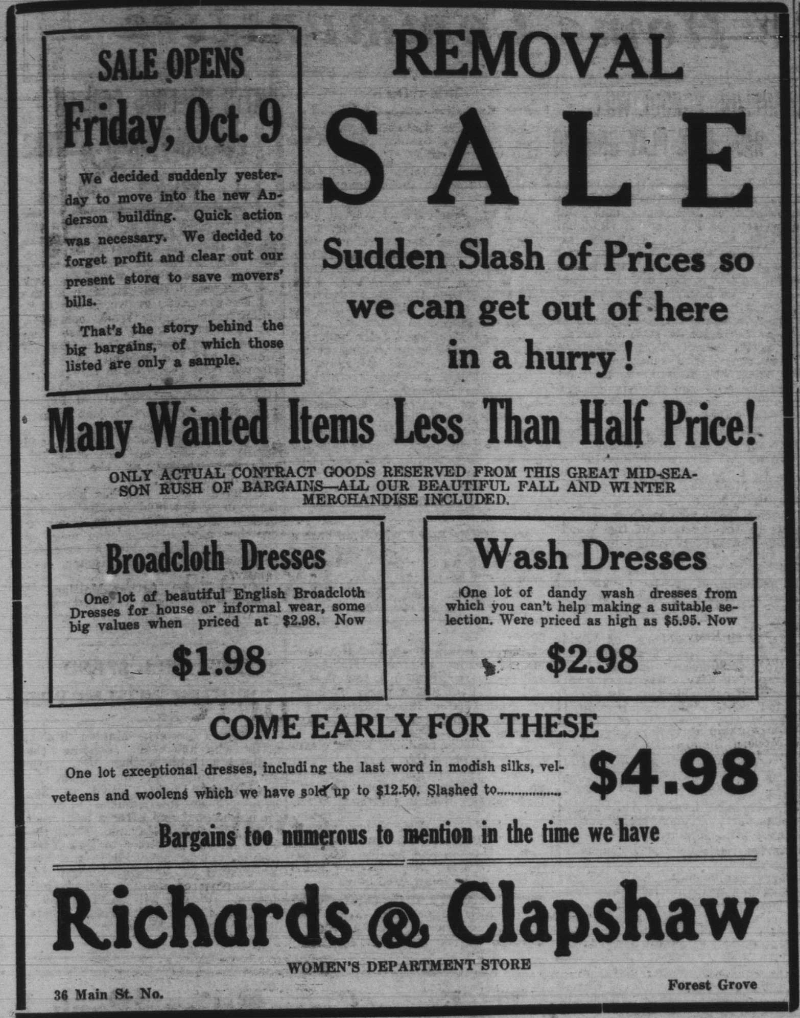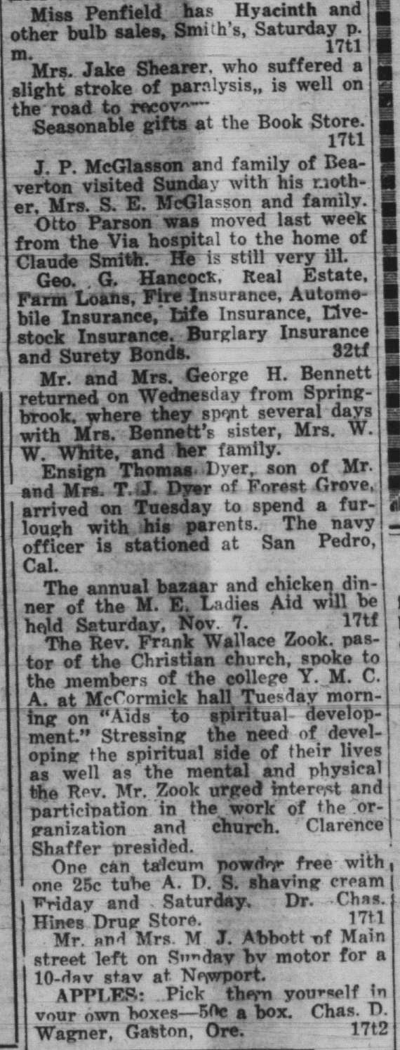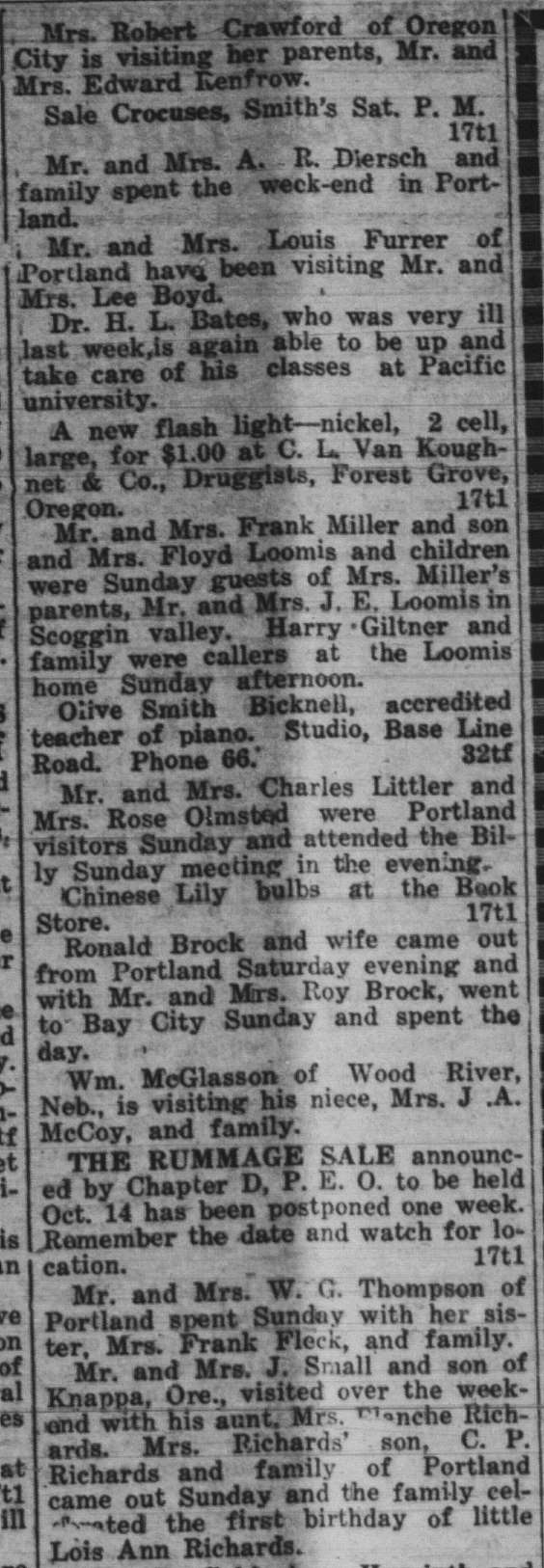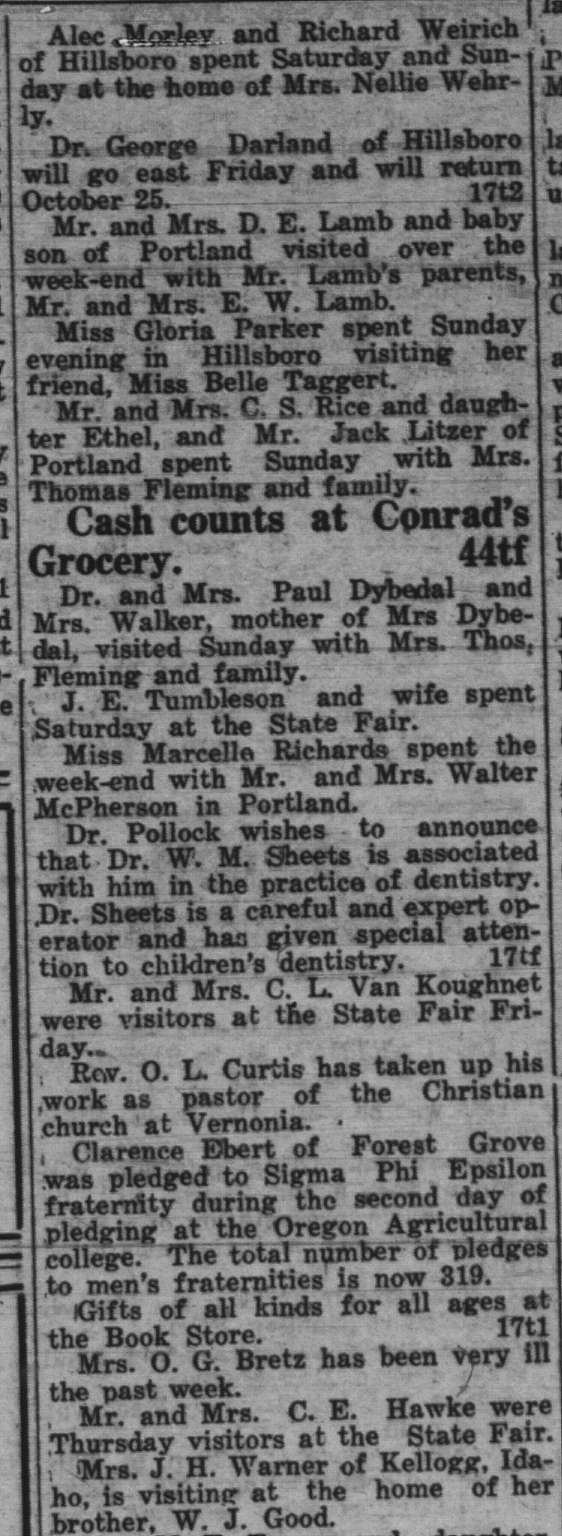 In this column, we take a look back one hundred years ago in Forest Grove. This week, the clips come from the Washington County News-Times, published October 9, 1925. Tap on an image to bring it into focus.