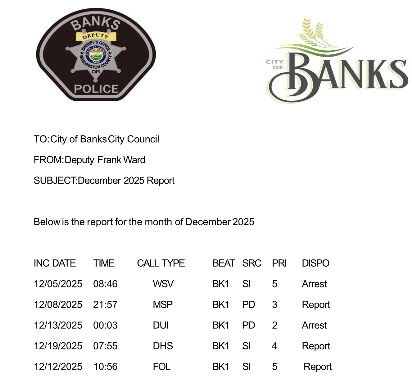 As presented to the Banks City Council on January, 13, 2026 by Deputy Frank Ward with the Washington County Sheriff’s Office. The Banks Post does not write, edit, or alter the contents of the police log.