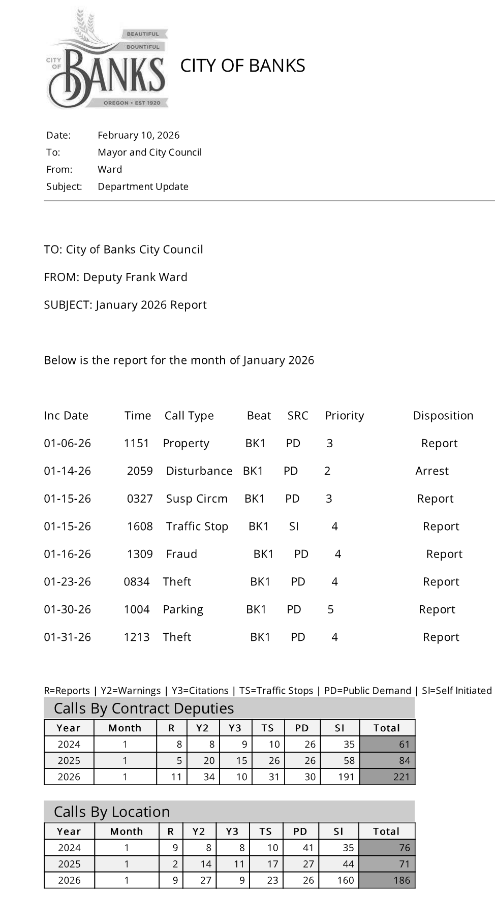 As presented to the Banks City Council on February 10, 2026 by Deputy Frank Ward with the Washington County Sheriff’s Office. The Banks Post does not write, edit, or alter the contents of the police log.