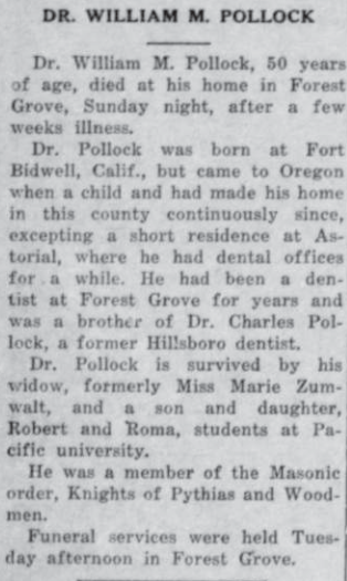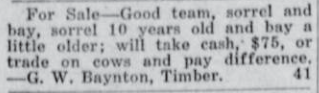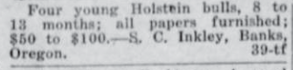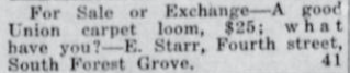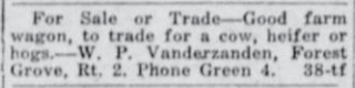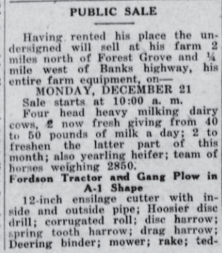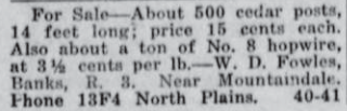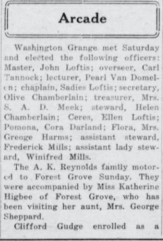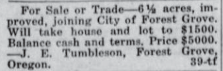 These news clips are selected for news events in and around Forest Grove and Banks that I believe would have been of significance to readers of the time, or of interest to readers of today. They are presented as-is, and without comment. At the time, the newspapers of the day often expressed viewpoints that today would be considered racist, xenophobic, and sexist, frequently using slurs to describe ethnic groups and often stepping outside the norms of what we consider to be ethical journalism today.