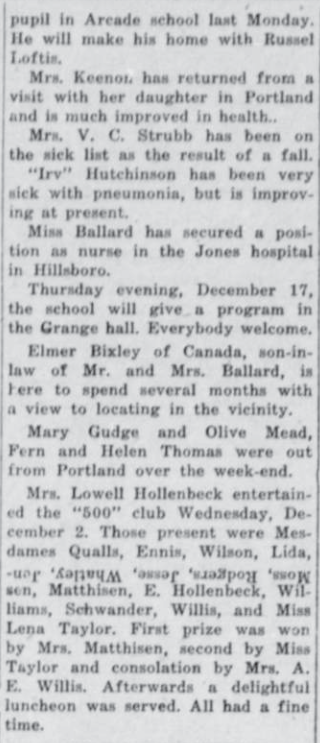 In this column, we take a look back one hundred years ago in Forest Grove, Banks, Gales Creek, and other rural communities in western Washington County. This week, the clips come from the Hillsboro Argus, published December 10, 1925. Tap on an image to bring it into focus.