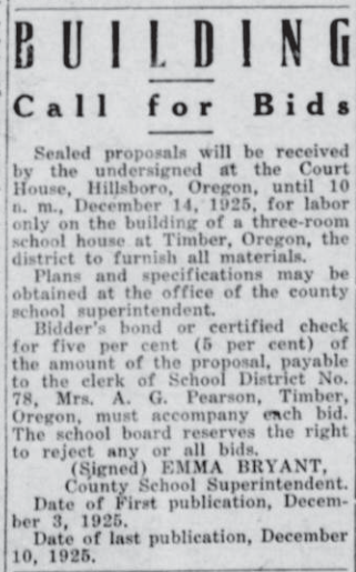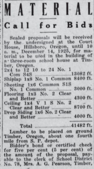 Bids went out in 1925 for work and materials for a three-room schoolhouse in Timber to replace a previous building destroyed by fire.