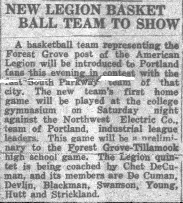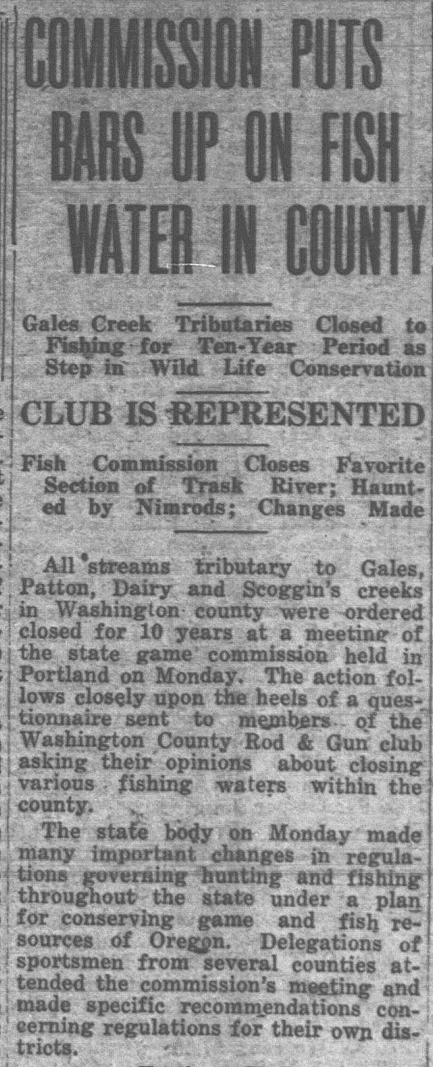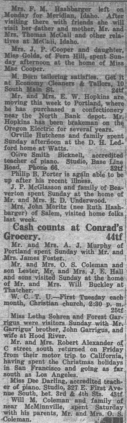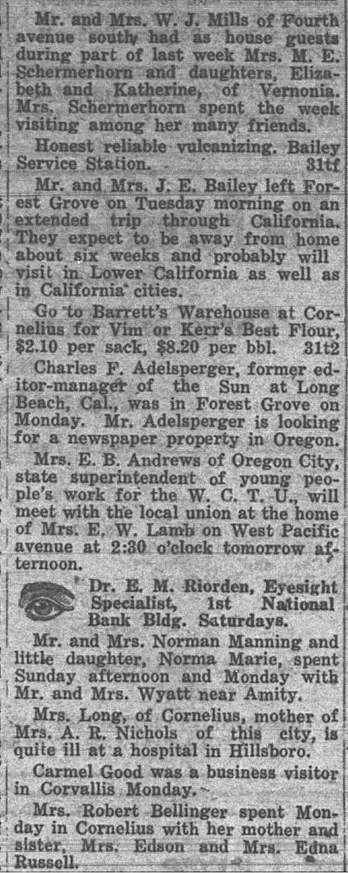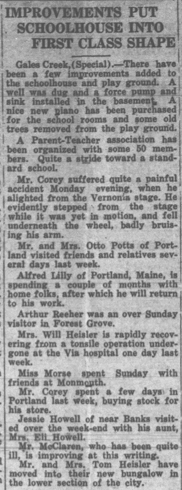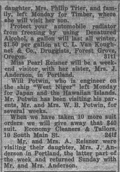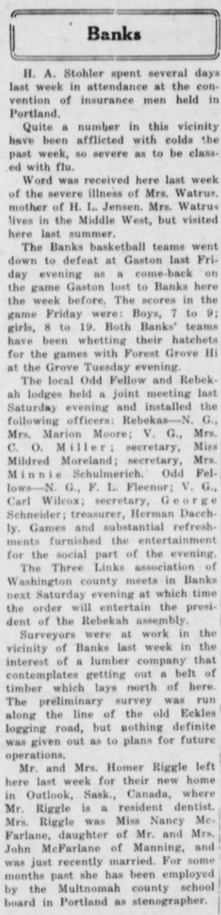 These news clips are selected for news events in and around Forest Grove and Banks that I believe would have been of significance to readers of the time, or of interest to readers of today. They are presented as-is, and without comment. At the time, the newspapers of the day often expressed viewpoints that today would be considered racist, xenophobic, and sexist, frequently using slurs to describe ethnic groups and often stepping outside the norms of what we consider to be ethical journalism today.