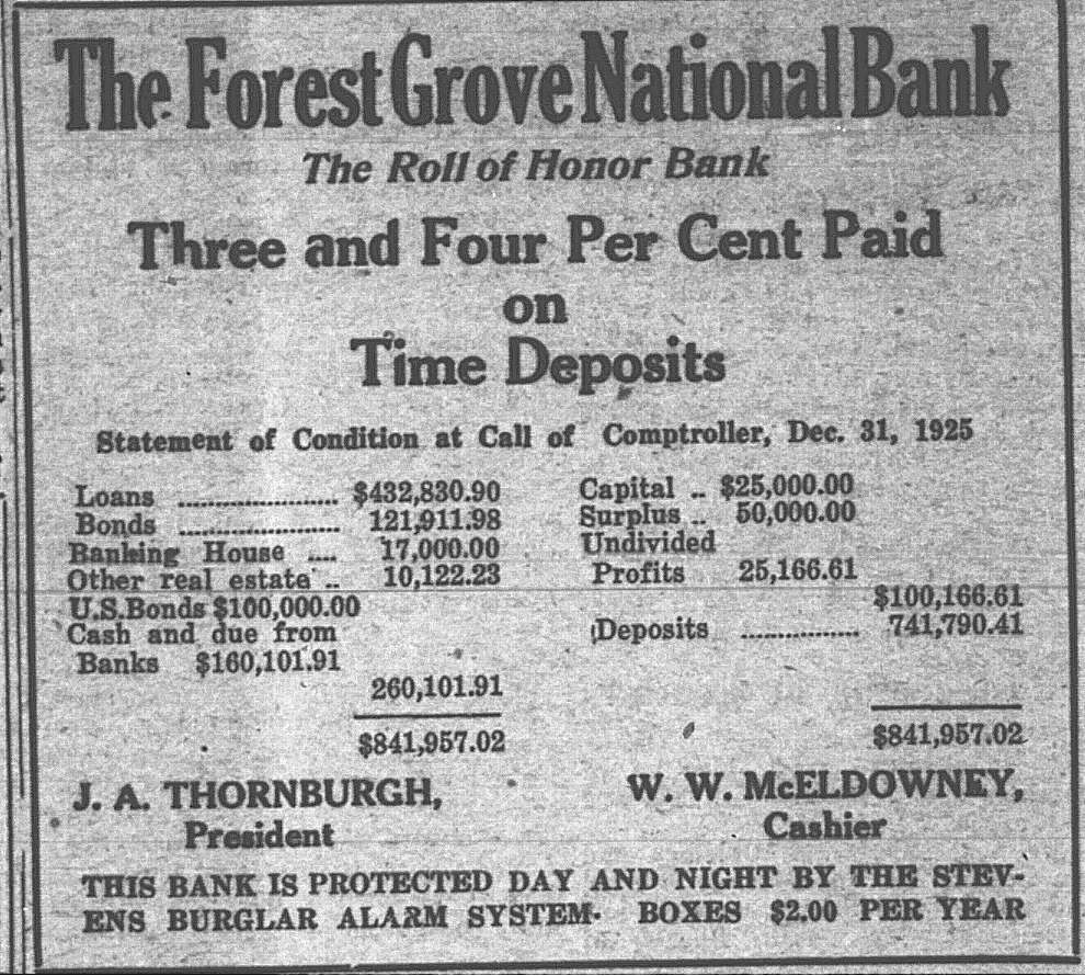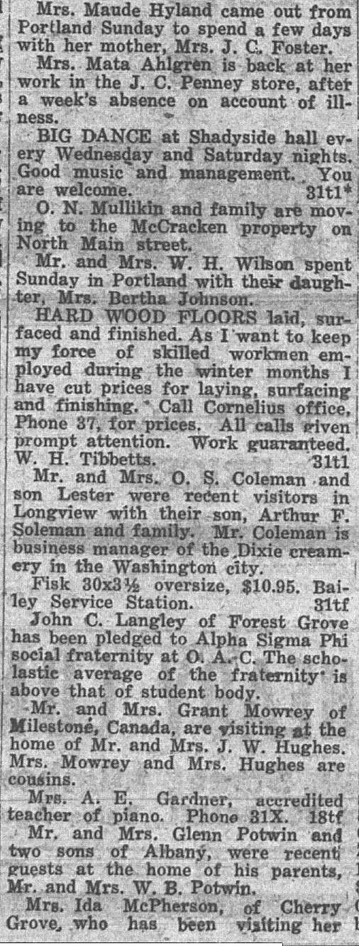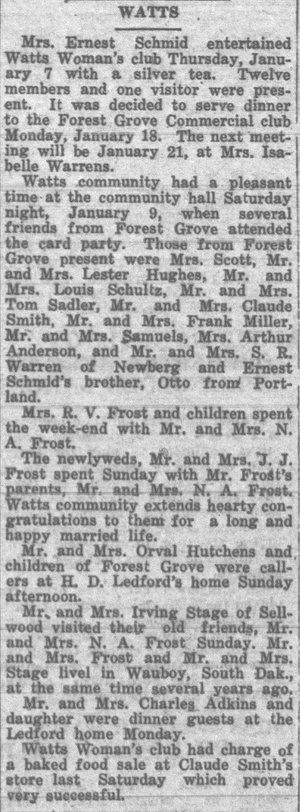 In this column, we take a look back one hundred years ago in Forest Grove, Banks, Gales Creek, and other rural communities in western Washington County. This week, the clips come from the Washington County News-Times and the Hillsboro Argus, each published January 7, 1926.
