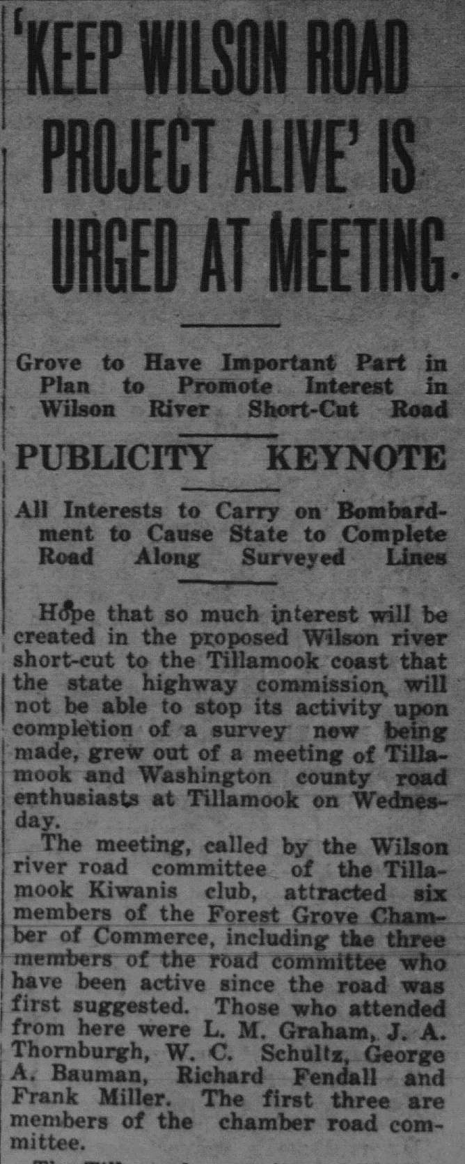 1926: A dream of a highway connecting Forest Grove to Tillamook continued. Dilley and Gales Creek feuded over flowers. Bacona, north of Buxton, still had a post office. Step into Forest Grove and Banks-area history from the lens of newspaper archives of the day.