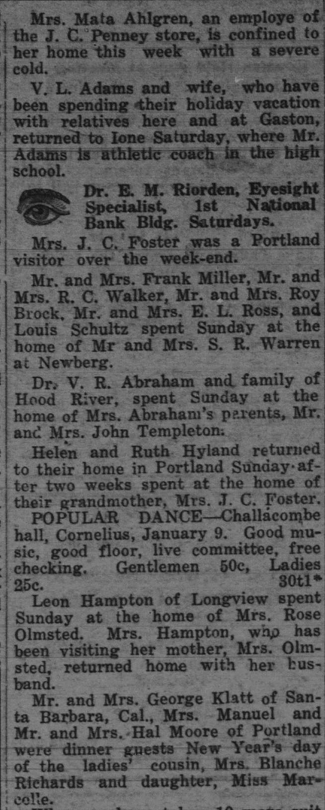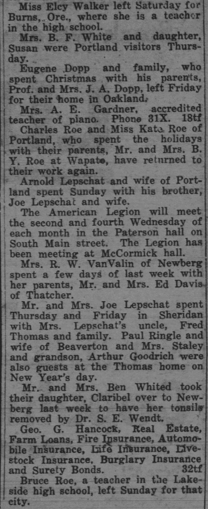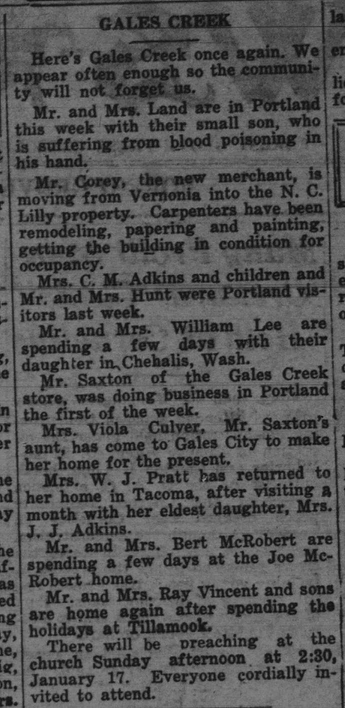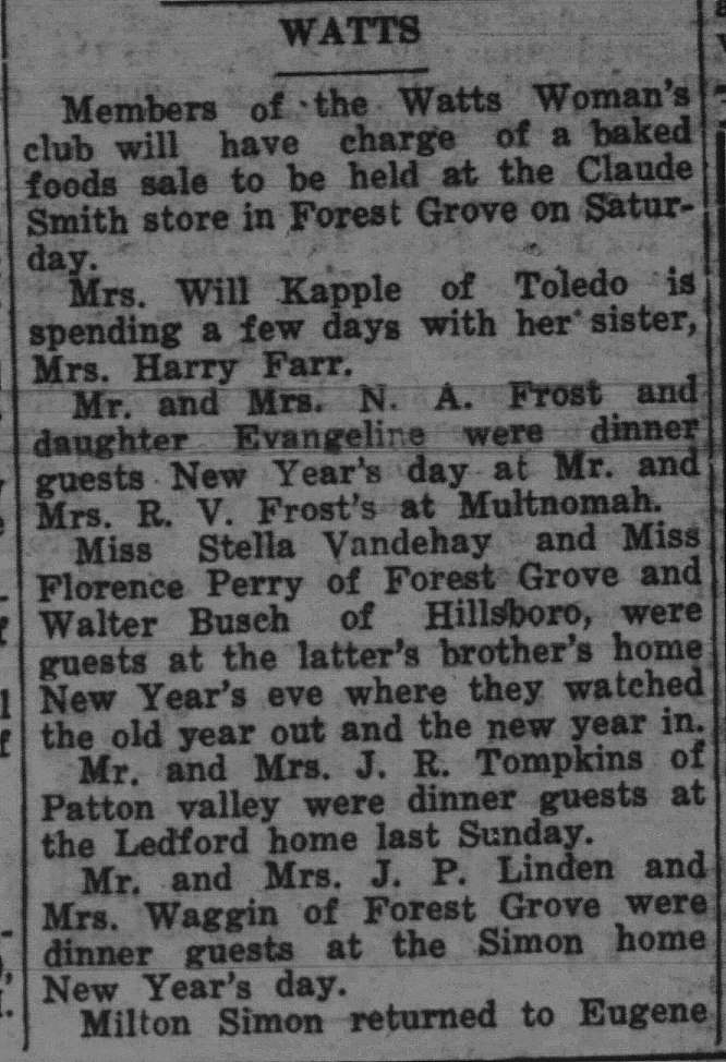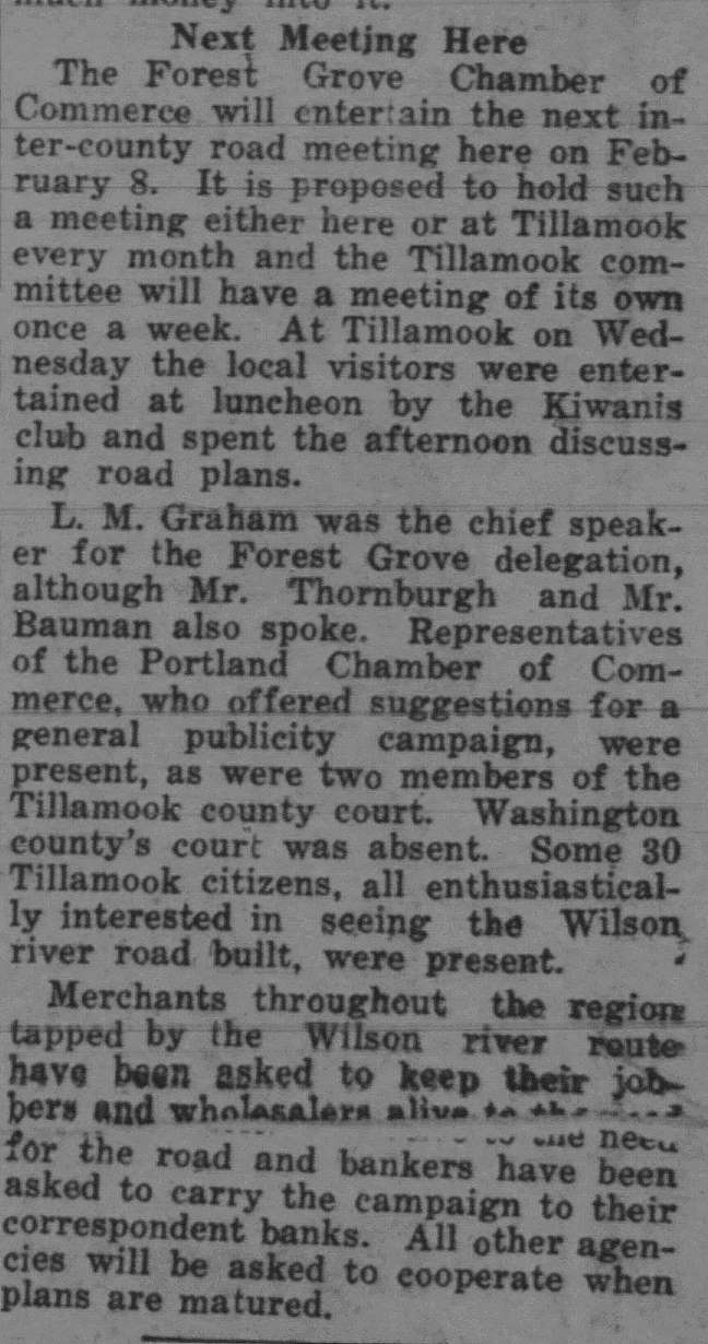 In this column, we take a look back one hundred years ago in Forest Grove, Banks, Gales Creek, and other rural communities in western Washington County. This week, the clips come from the Washington County News-Times and the Hillsboro Argus, each published January 7, 1926.