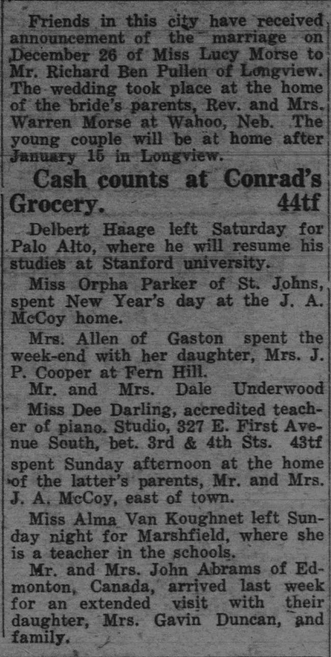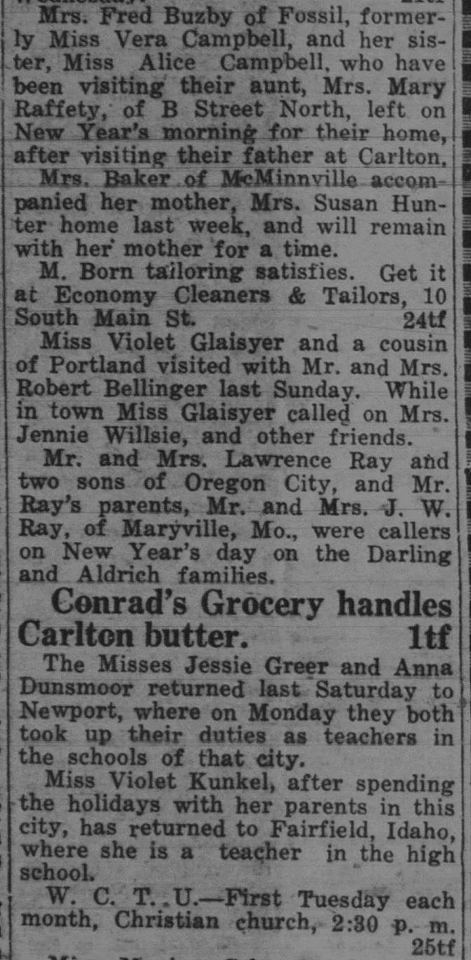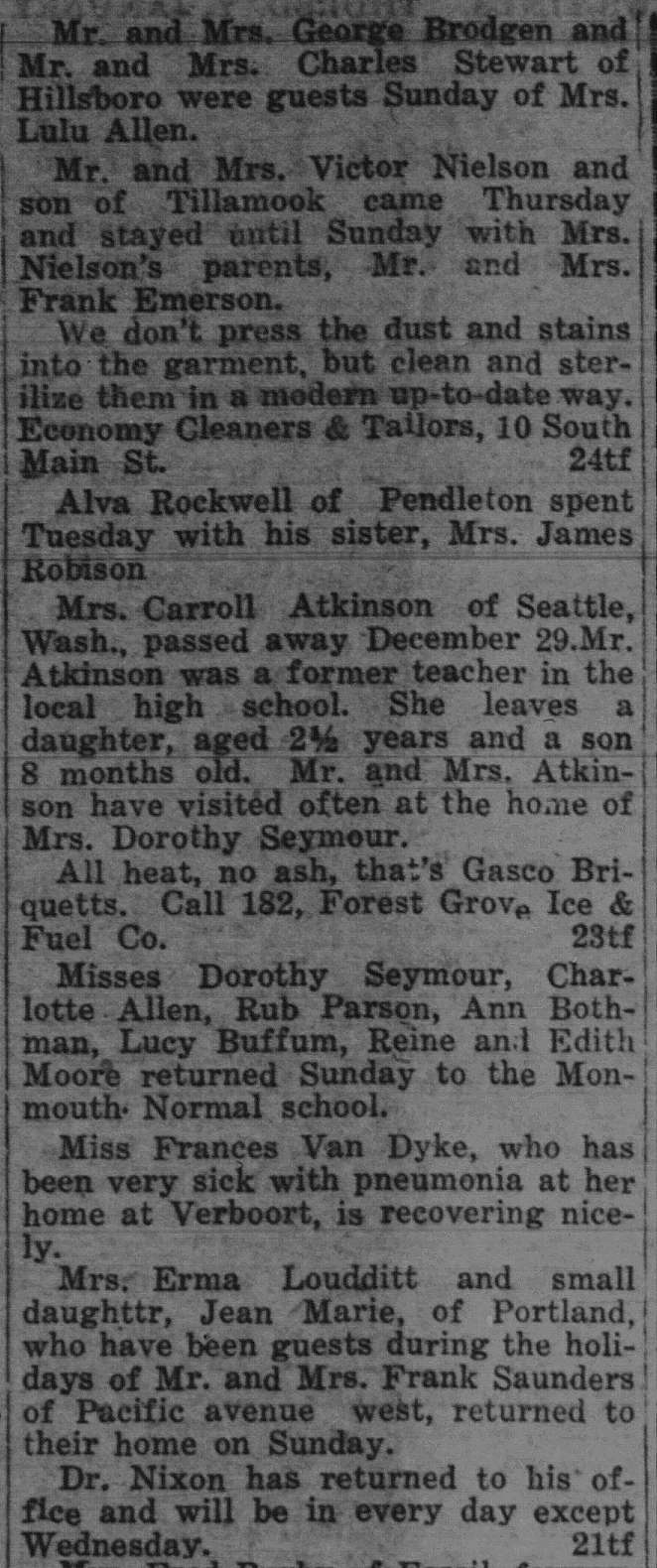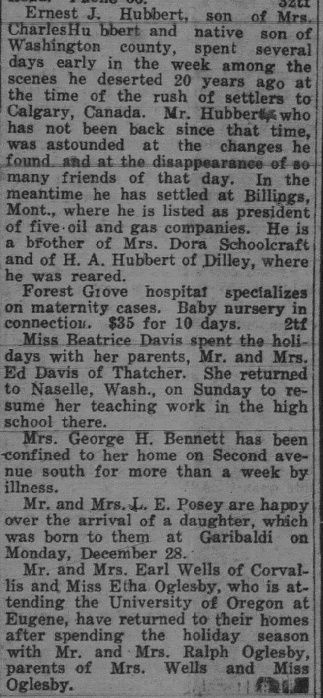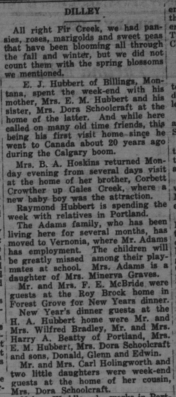In this column, we take a look back one hundred years ago in Forest Grove, Banks, Gales Creek, and other rural communities in western Washington County. This week, the clips come from the Washington County News-Times and the Hillsboro Argus, each published January 7, 1926.