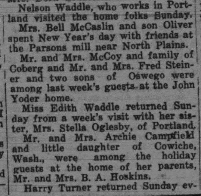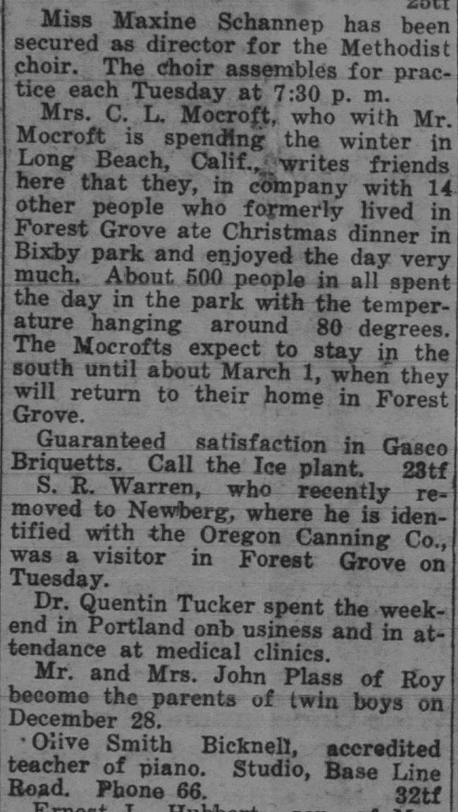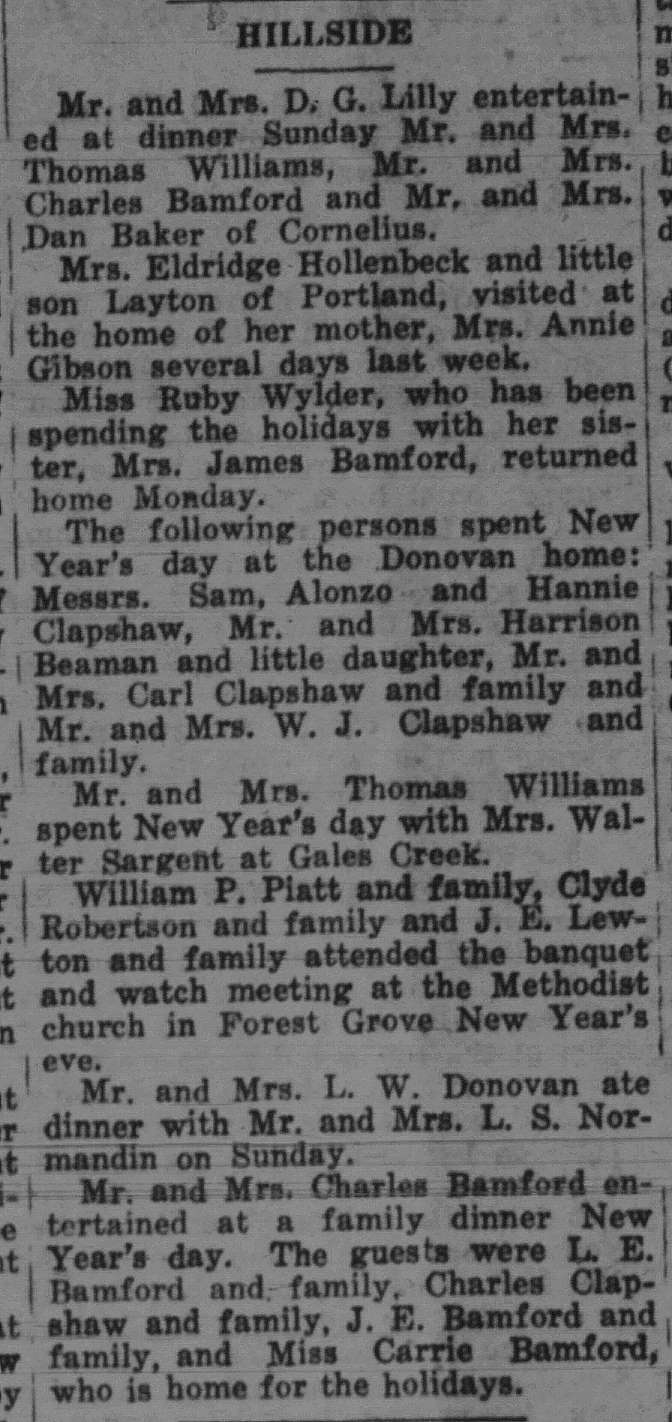 These news clips are selected for news events in and around Forest Grove and Banks that I believe would have been of significance to readers of the time, or of interest to readers of today. They are presented as-is, and without comment. At the time, the newspapers of the day often expressed viewpoints that today would be considered racist, xenophobic, and sexist, frequently using slurs to describe ethnic groups and often stepping outside the norms of what we consider to be ethical journalism today.